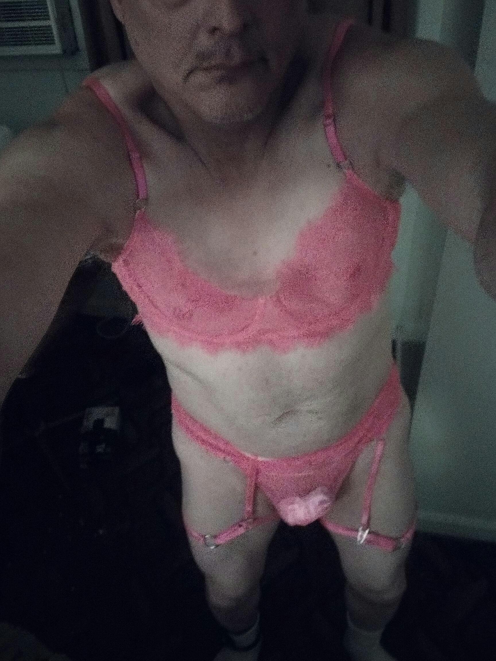 Neon pink feminine male underwear set – lace panties, bra, and garter belts for men by Fireponyshop